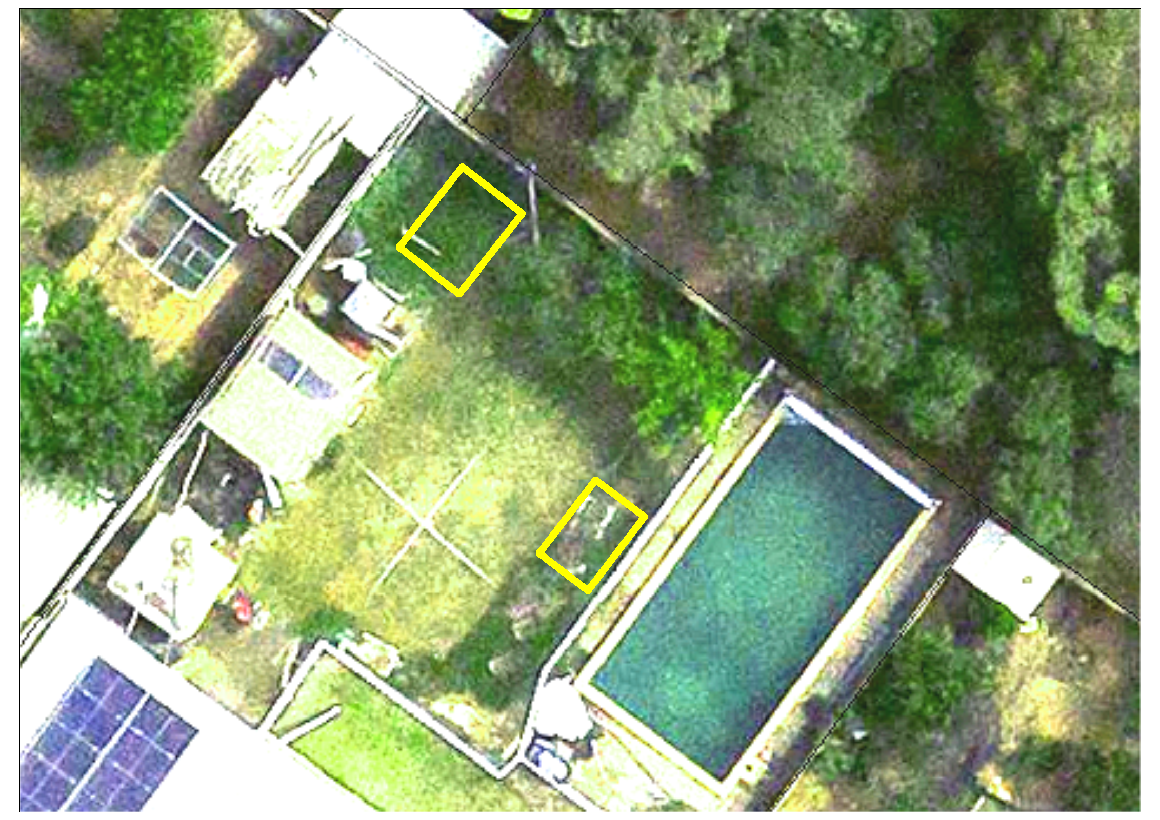 The rightmost area of the image and backing onto the swimming pool enclosure gets some shade in the morning from tall trees out of view in the cemetery. Being next to the swimming pool, it is a convenient location if pool water monitoring is implemented. It is also located between garden beds which would make the monitoring of ground temperature and soil moisture easy. The closest mains power is near the bottom right corner of the pool. This would mean that any power cable from that outlet would need to cross the entrance to the pool enclosure or the path around the pool.