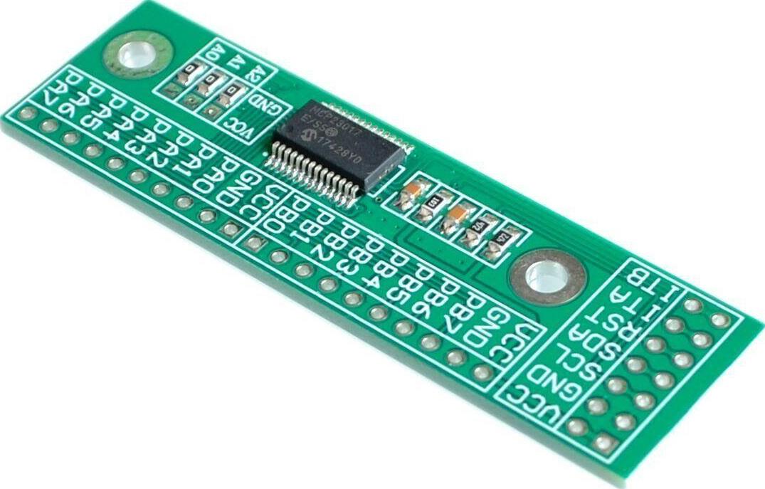 Because two (2) MCP23017 units are being used on the same bus, the address on one of the units must be changed by altering the jumper on the A0 address line. The unit where the address is not altered will have the address 20, while the one with the change to the A0 address line will be 21.