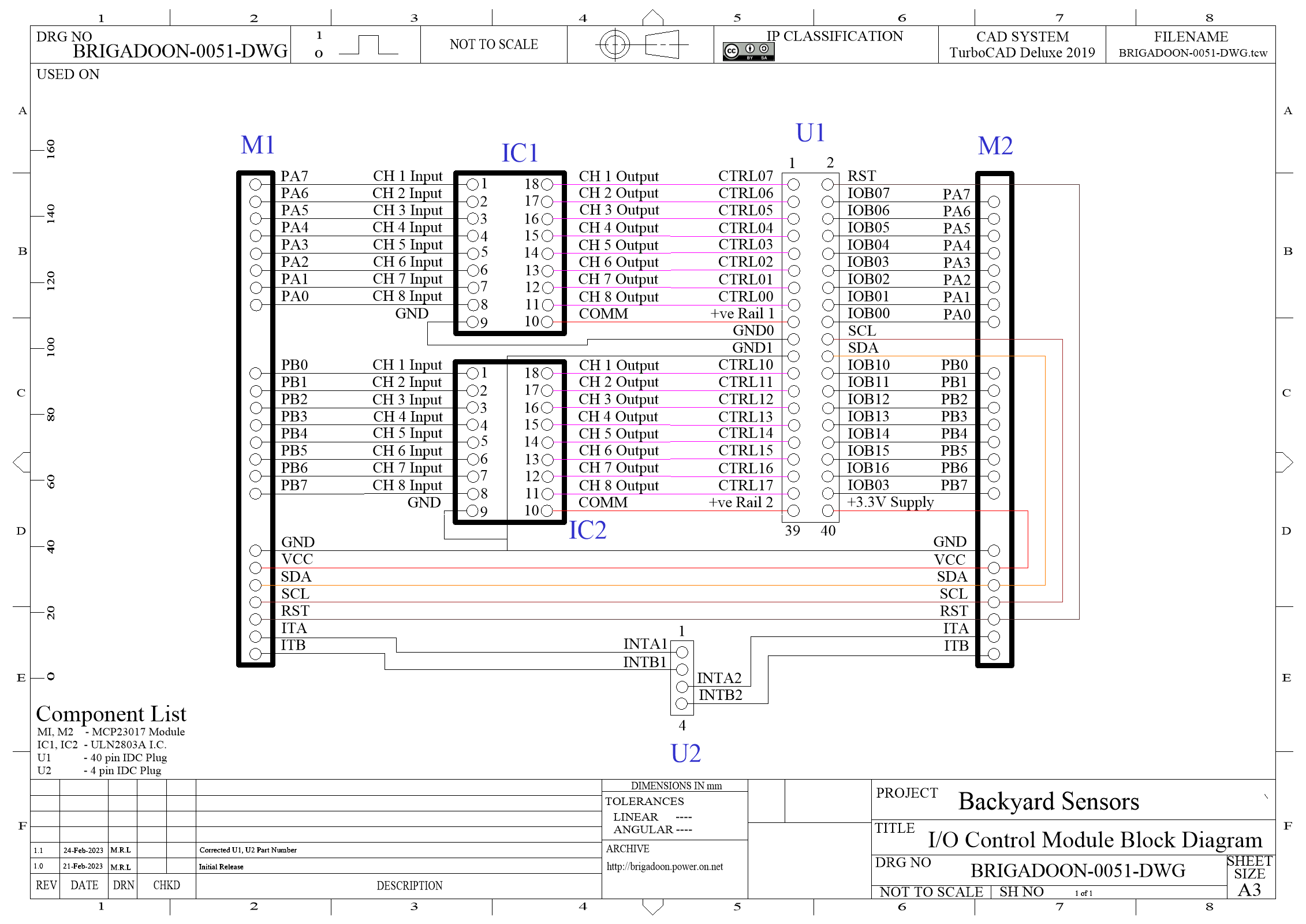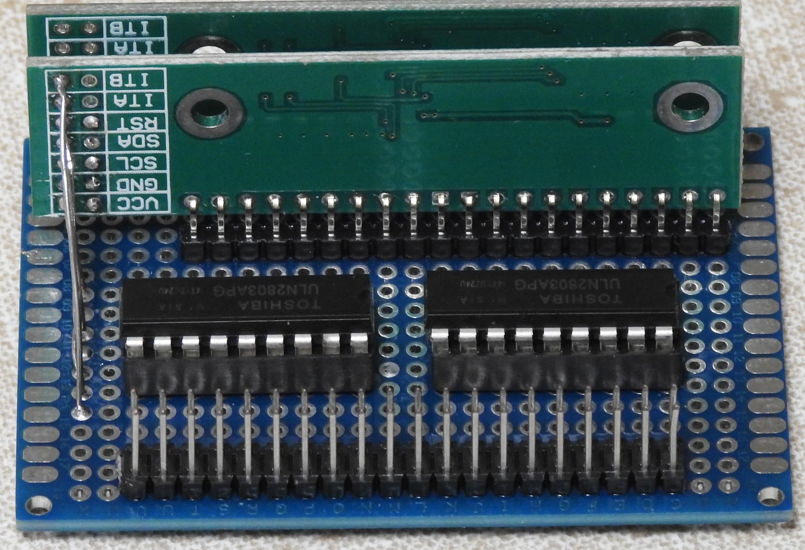 The I/O Module is built on a 6cm x 4cm prototype board, with two (2) MCP23017 modules mounted vertically on the board. There are two (2) ULN2803a open collector Darlington arrays. One array has its flyback diodes connected to the +5V supply. This MUST be connected to the +5V rail as this also supplies power to the MCP23017 chips.