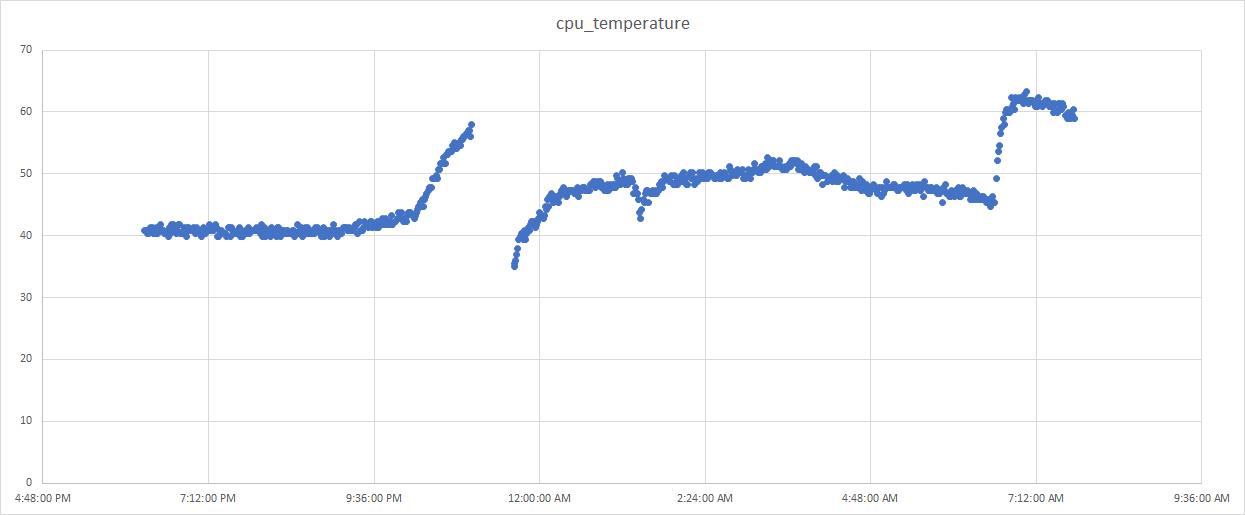 At the point of the discontinuity, the system is powered down and the Raspberry Pi case is removed and the base swapped for the base holding the fans. After the fans are wired to the +5V supply, the system is restarted. The reason that the temperature has dropped so much is that the system has been powered off and the cabinet open to the cool morning air while the modifications were made.